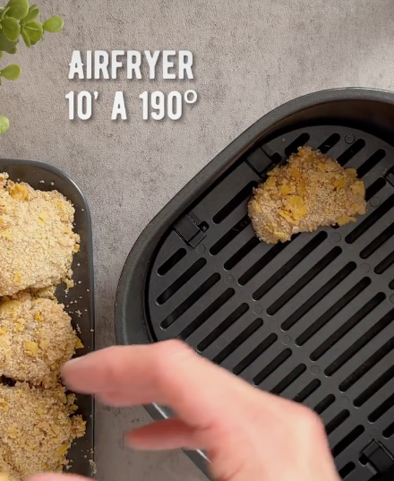Ponemos los trocitos de pollo en la mezcla y dejamos reposar unos minutos. Ahora empanamos! (yo utilicé pan rallado, copos de maíz, y semillas). Te recomiendo hacerles doble empanado, queda brutaaal! Por encima fus de aceite de oliva.