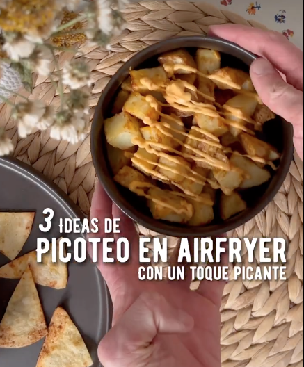 Cortamos las patatas en cuadraditos. Ahora las condimentamos con aceite de oliva, condimentos (sal, pimienta, pimentón) y grana padano. Mezclamos bien y llevamos a la Airfryer por 15´ a 190º. Te recomiendo que cada 5´ las muevas un poco.