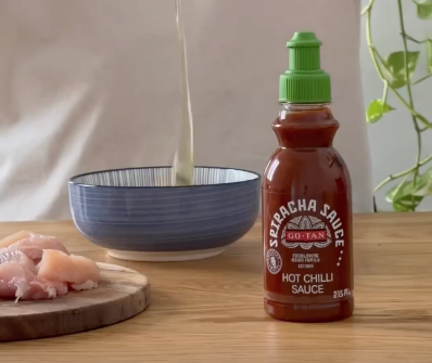 Cortamos una pechuga de pollo en trocitos. Mientras tanto preparamos una mezcla con 2 huevos con condimentos (sal, pimienta, pimentón, hierbas provenzales), y para darle un toque picantito le agregamos una cucharada de siracha.